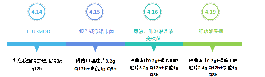 4月15日临床调整用药方案,炎症指标下降,病人病情稳定。
