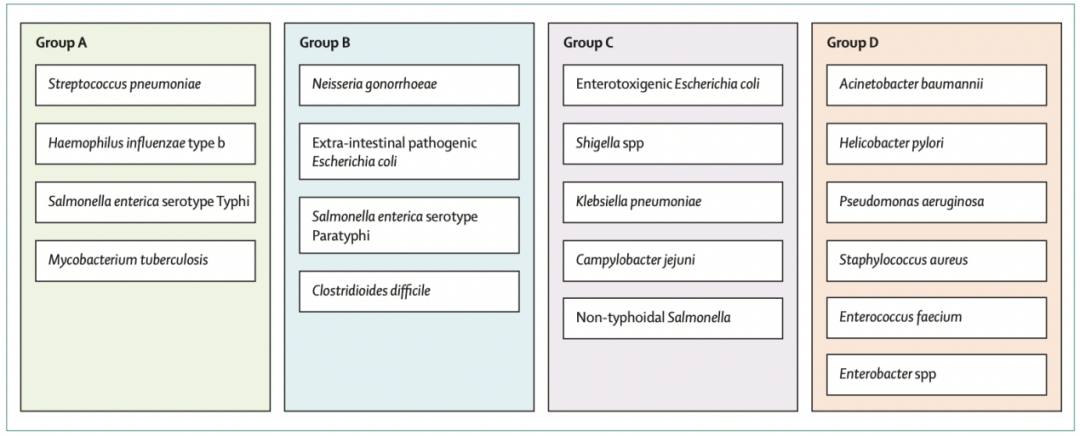 该组包括金黄色葡萄球菌(Staphylococcus aureus),并有一款候选疫苗处于二期临床试验。针对鲍曼不动杆菌(Acinetobacter baumannii)、铜绿假单胞菌(Pseudomonas aeruginosa)、幽门螺旋杆菌(Helicobacter pylori)目前没有候选疫苗。除了肠杆菌属(Enterobacter spp)和屎肠球菌(Enterococcus faecium),细菌重点病原体清单中的所有病原体都有候选疫苗处于临床前期开发阶段。