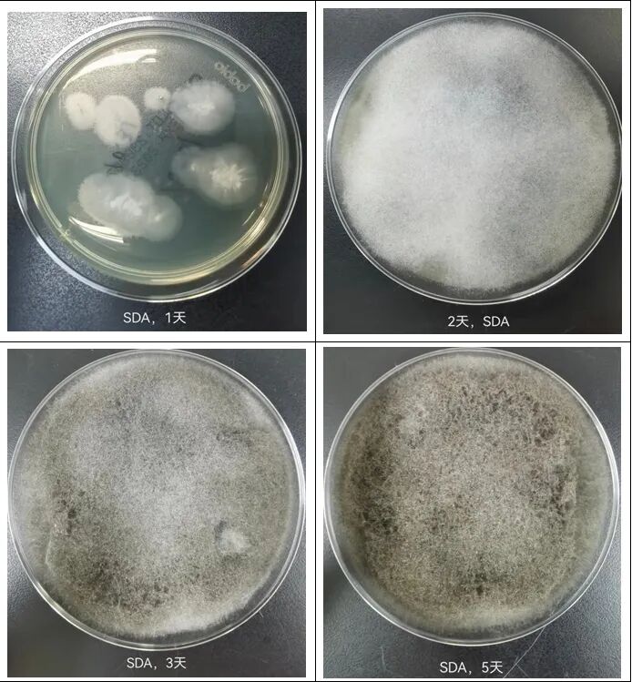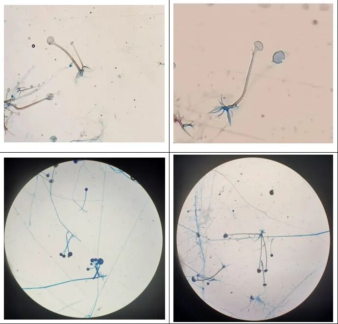细菌涂片及培养:阴性;抗酸涂片:阴性;真菌培养:小孢根霉(图4);菌落镜下形态:菌丝直径6-15微米,无隔或极少有隔,光滑,无色或浅灰色;假根形成于匍匐菌丝下;孢囊梗可长达4mm,与假根对生,直立,单生或丛生,分枝或不分枝;孢子囊直径40-350微米,顶生,球形;囊壁表面光滑或有针状结晶,成熟后易消融或破裂;1天为白色,3天后变为黑色。(图5)
