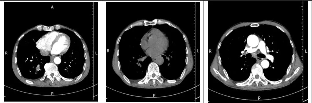 肺部CT:双肺炎症,右肺下叶团片状阴影;双肺微小结节及类结节;双肺纤维灶;纵隔及右肺门多发淋巴结;右侧少量胸腔积液;胸主动脉及冠状动脉钙化。见图1