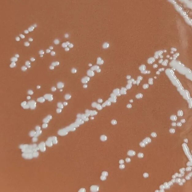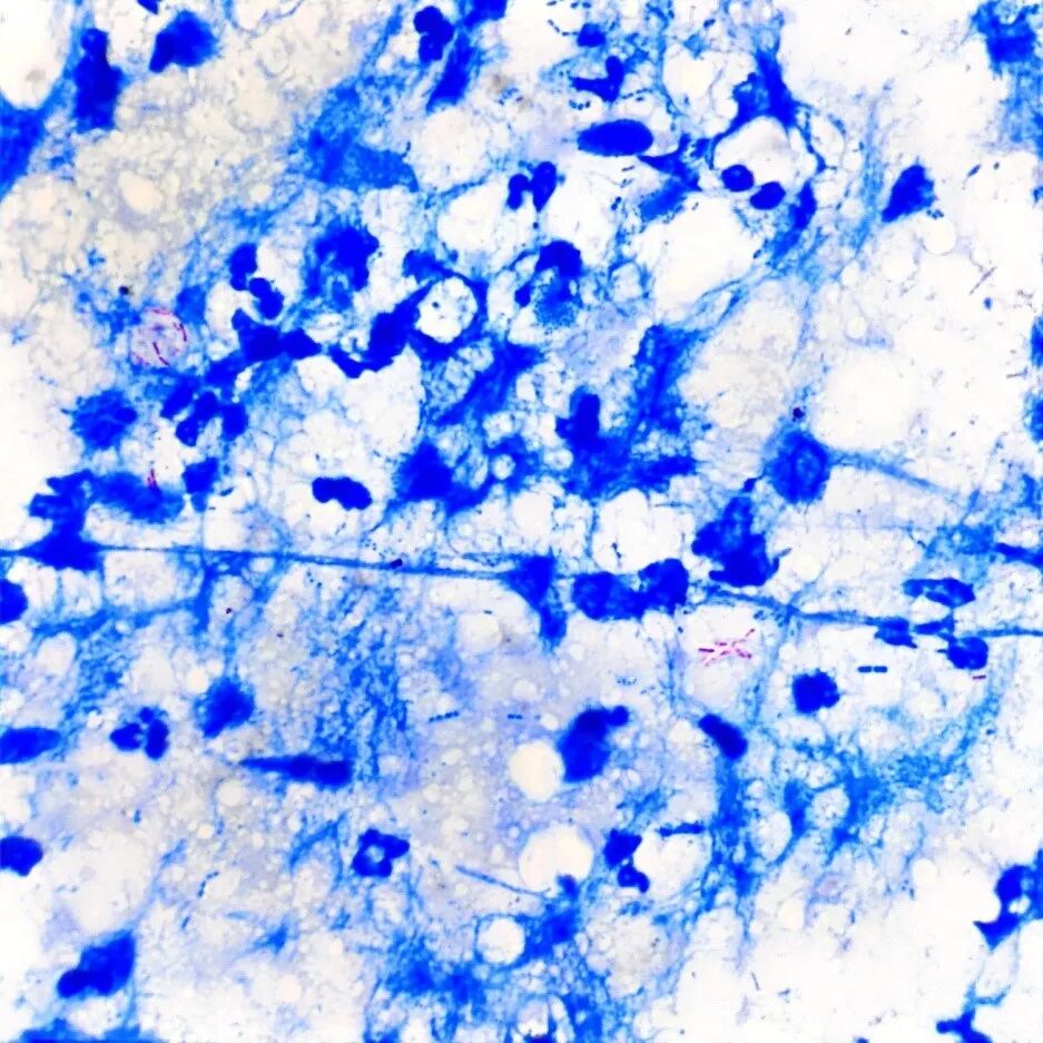 1.患者于12.21进行支气管灌洗,随即送灌洗液进行微生物检查,结核分枝杆菌rpoB基因和突变检测阴性,抗酸染色镜下菌体细长,稍弯曲,两端钝圆,革兰染色不着色,抗酸染色强阳性,猜测该患者是否为肺结核分枝杆菌感染,立马找到该患者灌洗液标本在血平板和巧克力平板上接种,35℃培养4个工作日可见到粗糙,不透明,乳白菌落。