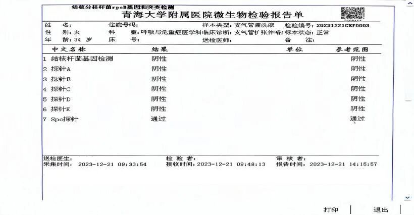 2023.12.21:支气管灌洗液找抗酸杆菌阳性(++):1-9条/10视野;结核分枝杆菌rpoB基因和突变检测阴性。