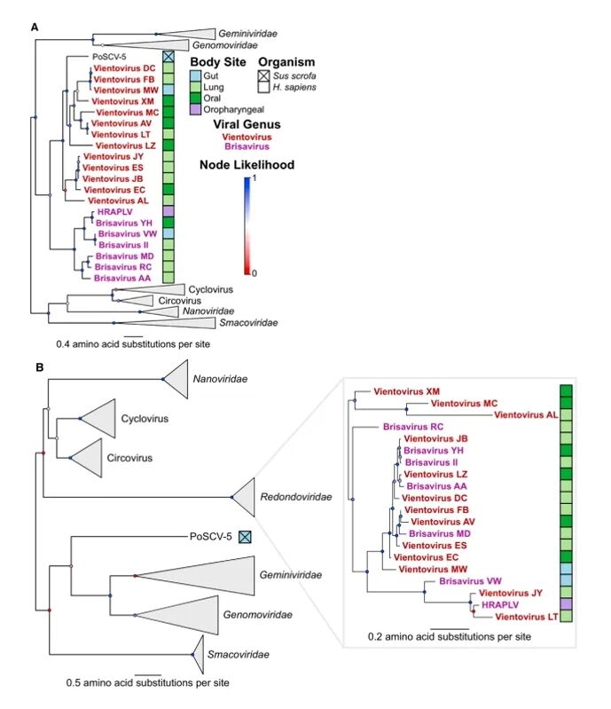 ▲Figure 2. Redondoviridae Is a Distinct Virus Family Based on Capsid and Rep Identities Phylogenetic Trees of Redondovirus Rep