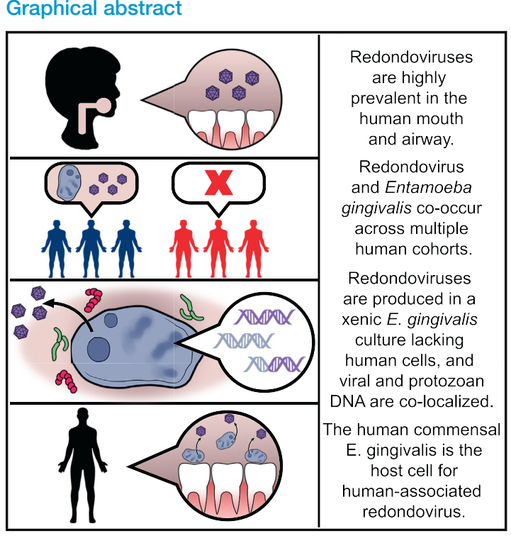 2019年的一项研究发现,Redondoviridae家族是一类小型、环状DNA病毒,它们广泛存在于人类口腔和呼吸道,与牙周病和危重病情相关。而最近的研究则探讨了这些与人类相关的Redondoviruses在共生原生生物Entamoeba gingivalis中的感染。在本期前沿速递,将分别介绍这两项研究。