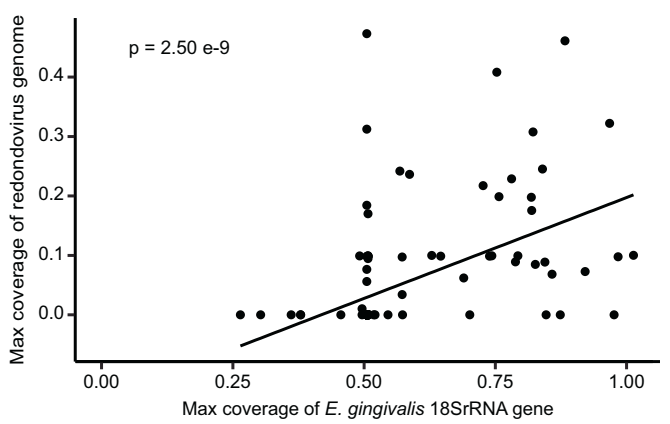 ▲Figure 6. Redondovirus and E. gingivalis abundance are positively associated with metagenomic DNA sequence data