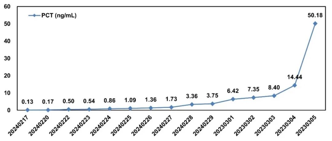 图2b 住院期间降钙素原变化(参考范围0-0.5 ng/mL)