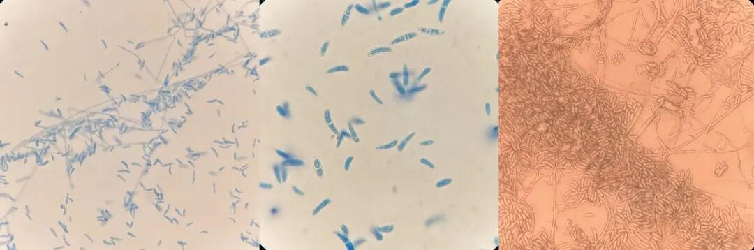 图3g棉兰染色×400、棉兰染色×1000、未染色×400镜下孢子和菌丝