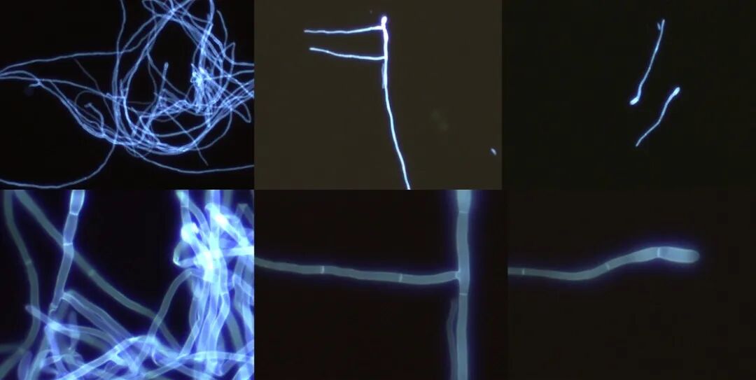 图3e 血培养标本荧光染色×100(上1、2、3)、×400(下1、2、3)镜下菌丝