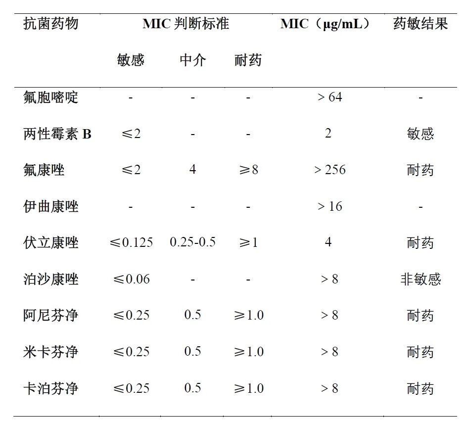药敏试验采用Sensititre®YeastOneTM比色法进行,试验结果按照美国临床实验室标准化协会(CLSI)丝状真菌药敏试验判断标准进行判定,具体参考文件为 CLSI M61(第2版),结果见表1。