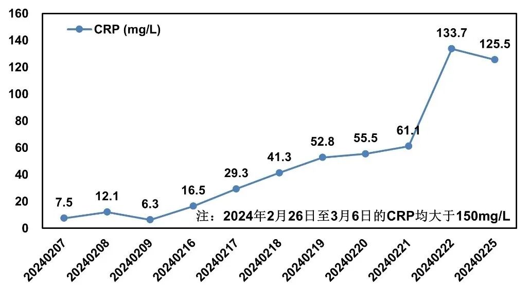 图2a 住院期间C反应蛋白变化(参考范围0-10 mg/L)