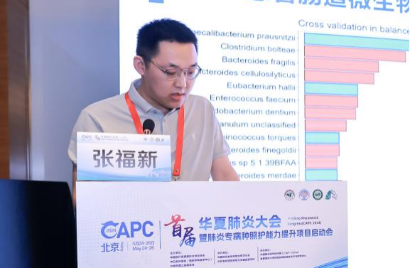 第六位讲者是来自淄博市市立医院的张福新,讲题为《社区获得性肺炎患者肠道菌群与代谢组学分析》。社区获得性肺炎(CAP)是大范围影响人类健康的最重要疾病之一,肠道微生物群及其衍生的代谢物对呼吸道感染免疫应答起重要作用。研究者收集32名CAP患者和48名健康志愿者的粪便标本,通过鸟枪法宏基因组测序确定肠道菌群组成,非靶向代谢组测序定量肠道菌群衍生代谢物,发现次级胆汁酸合成能力受损、短链脂肪酸产生不足以及过度代谢炎症是CAP患者肠道菌群失调的主要特征,这些发现可能为解释肠道微生物-代谢物相互作用在肺炎的发生发展中的作用提供新的见解,为靶向肠道菌群治疗肺部疾病和维持肺部免疫微环境稳态提供了新依据。