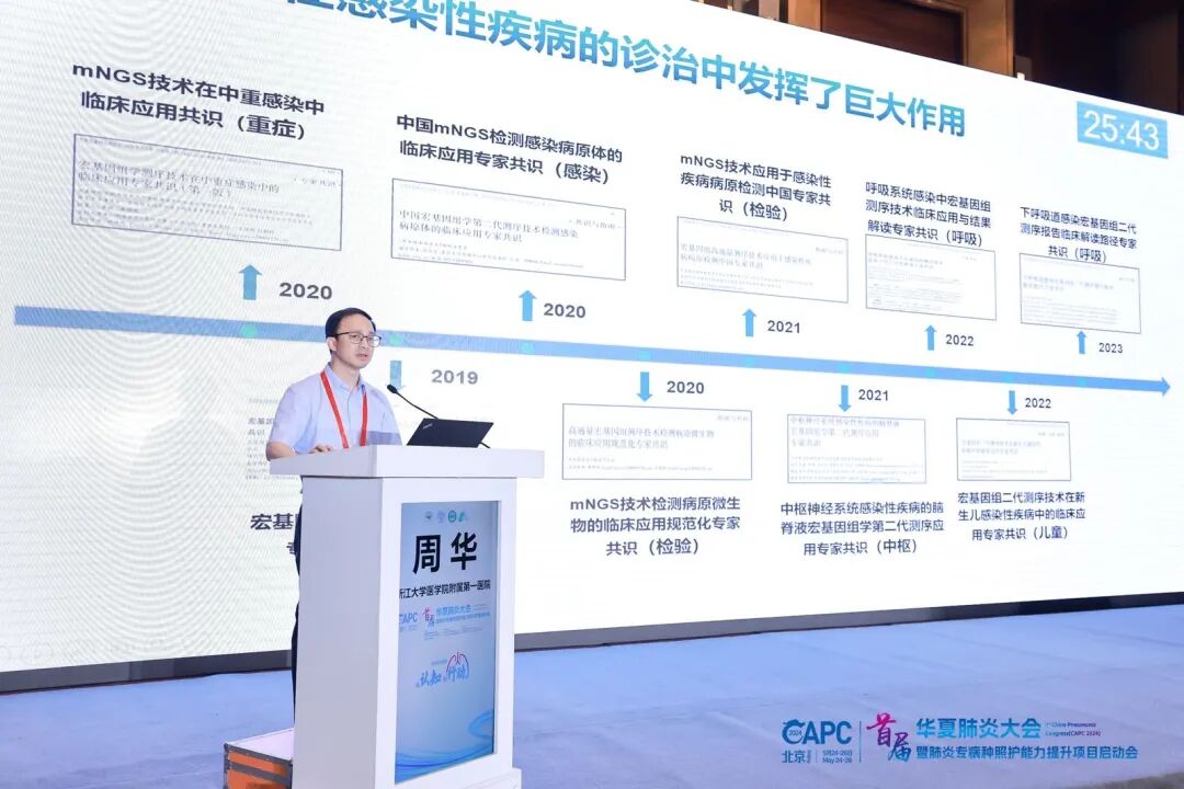 第四位讲者是来自浙江大学医学院附属第一医院的周华教授。他带来了《探针捕获NGS(MetaCAPTM ) 在免疫缺陷人群肺炎病原精准诊断中的应用》的学术专题报道。首先他指出传统方法(培养、免疫与PCR)循证依据多,应用广泛,但阳性率低、耗时费力,而mNGS则打开病原检测的潘多拉星球,改变了临床感染病原诊断模式,但同时指出其存在的几大缺陷,包括DNA和RNA双流程如何选择问题、去宿主技术的弊端等。那有什么更好的解决方法,既可以兼顾mNGS的广谱、无需预测的优点,又可以排除宿主干扰、实现精准鉴定的目的呢?探针捕获法mNGS病原测序新技术-MetaCAPTM完美满足了以上展望,讲者就探针捕获技术临床应用的主要方向、病原鉴定与全基因组探针设计、MetaCAPTM技术流程对该技术进行了介绍,指出MetaCAPTM可宏捕获检测范围,实现超低检测限、探针可覆盖 RNA 病毒全基因组,兼容病毒同源突变以及可覆盖重点关注病原的耐药位点等一系列特点,因此MetaCAPTM 实现了去宿主及百万探针宏捕获的两大关键突破,还可集成临床数据、自动生信及智能解读测序结果。最后,讲者就MetaCAPTM在免疫缺陷人群肺炎病原精准诊断中的价值进行了初步探索,该研究发现在病原检测性能上,MetaCAP较mNGS更具性价比,耐药基因检出敏感性更高,具有更高的卫生经济学价值。最后讲者总结到MetaCAP™ 既能实现检测性能的提升,又保留了病原全覆盖的特点,适用于临床最常见病原微生物的全面检测。