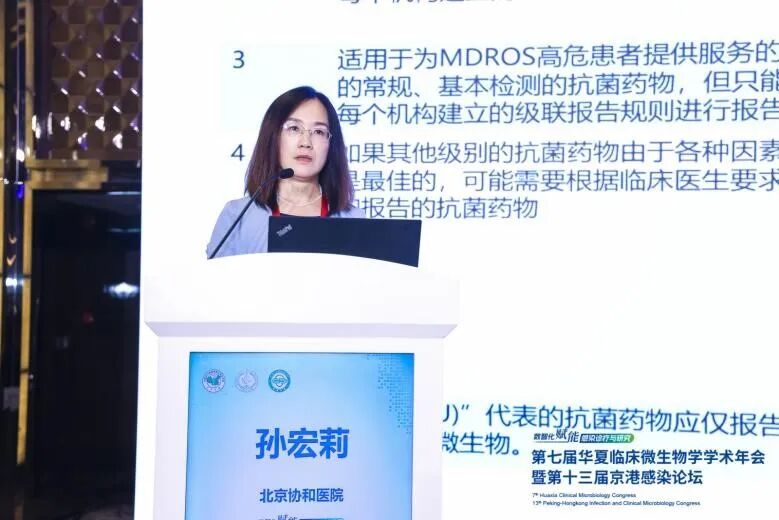 第一位讲者是北京协和医院的孙宏莉教授,讲座题目是:常见细菌真菌药敏试验的要点和报告。孙宏莉教授结合CLSI M100 ED34最新指南,围绕抗菌药物的选择和报告、报告结果和药敏结果审核、细菌商品化药敏检测系统和真菌药敏四个部分对临床常见的细菌真菌药敏的要点进行了讲解,并针对不同菌种的临床常见药敏问题及注意事项进行解惑。最后孙宏莉教授总结强调要选择适合的药敏试验方法及相应的判定标准,严格质控,保证药敏试验的准确性。