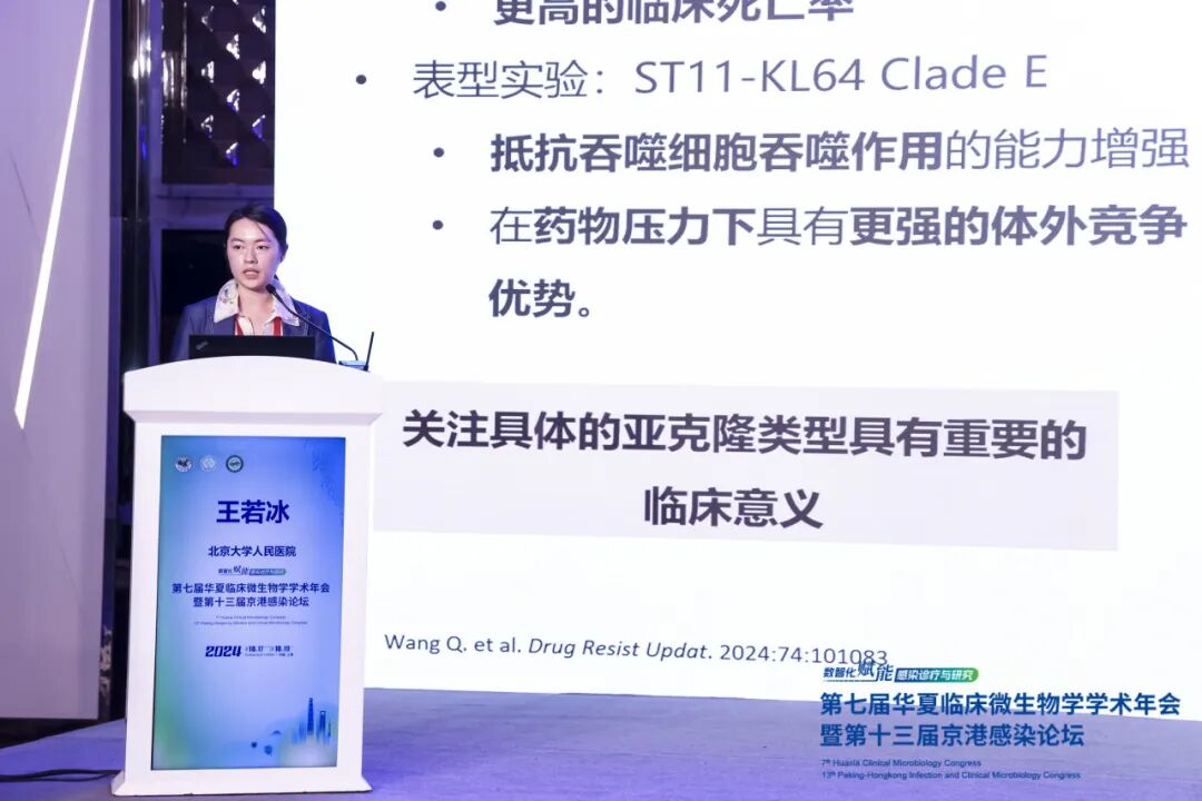首先是来自北京大学人民医院的王若冰副研究员做了题为《碳青霉烯耐药肺炎克雷伯菌的高危克隆进化与影响》的报告。WHO已经发布碳青霉烯耐药肺炎克雷伯菌(CRKP)已经成为临床重要泛耐药菌,对人类健康形成了严重威胁。王老师的研究聚焦于CRKP中的重要流行克隆——ST11-KL64,这一亚克隆已成为临床上新的优势亚克隆,并且其占比在国内显著上升。以此为基础,王老师探讨了ST11-KL64的起源、传播和进化趋势,揭示了基因突变对细菌适应性产生的影响。