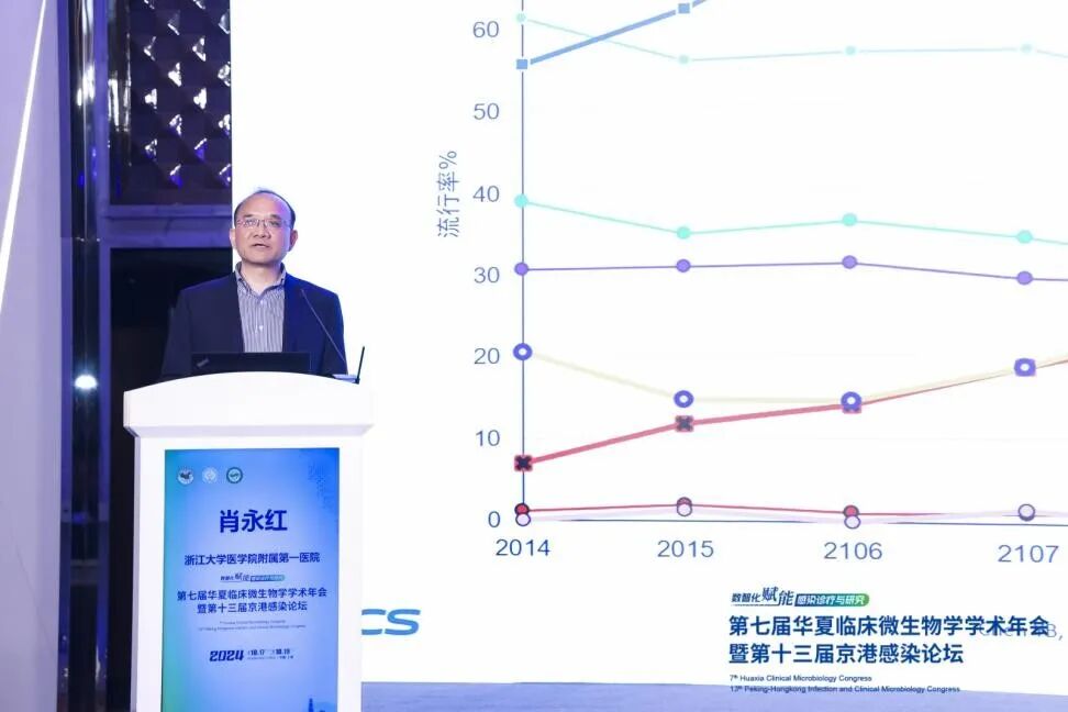 CRE防治版块的最后一位讲者是来自浙江大学医学院附属第一医院肖永红教授,肖教授以《碳青霉烯耐药菌防治进展》为题对CRO进行了全面的综述。肖永红教授强调了我国对碳青霉烯耐药细菌的密切关注,特别是高毒力CRKP ST11和ST23型肺炎克雷伯菌的流行。他指出,CRO感染的治疗选择有限,病死率高,因此新型抗生素如多粘菌素B和E的使用必须谨慎,以防止耐药性的增加。肖教授还提到了头孢地尔和舒巴坦/度洛巴坦等新药的研发,以及精准治疗的重要性,包括对患者进行基因检测以指导药物选择。他强调了新药研发的传统思路,即通过靶点发现和结构修饰来开发新化合物。最后,肖教授讨论了噬菌体疗法和抗菌肽的应用,并强调了全球合作对抗CRO的必要性,包括提高意识、加强实验室检测和感染控制措施。