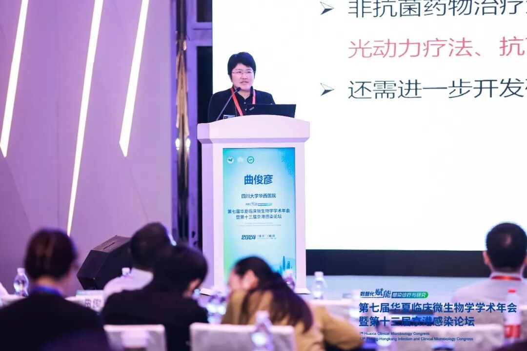 最后,来自四川大学华西医院的曲俊彦老师,介绍了细菌生物被膜的非抗菌药物治疗新进展。曲老师首先阐述了生物被膜的定义、形成过程及其与感染类型的关系,指出目前生物被膜感染的治疗仍以抗菌药物为主,但由于生物被膜中的细菌对抗菌药物广泛耐药,治疗效果有限。她详细介绍了非抗菌药物治疗的几大策略,包括生物膜破坏酶、群体感应抑制剂、纳米材料、光动力疗法等,重点提到了联合治疗的临床应用,并呼吁未来进一步研究和开发这些非抗菌治疗方法以提高其安全性和疗效。