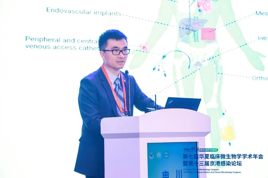 随后,河北医科大学第三医院的申川副教授,围绕“植入物相关感染的临床特征与防治策略”与大家进行了深入探讨。申老师从植入物相关感染的定义和流行病学出发,指出该类感染危险性高、具有较高的死亡率,且以生物膜形成机制为主。他详细介绍了人工关节假体、血管移植物及腔内移植物感染的病原学分布、临床表现和诊断标准,特别提到宏基因组测序、超声震荡等新技术在少见病原体诊断中的应用。最后,申老师对细菌生物膜研究的未来方向做了展望,提供了新的思路。