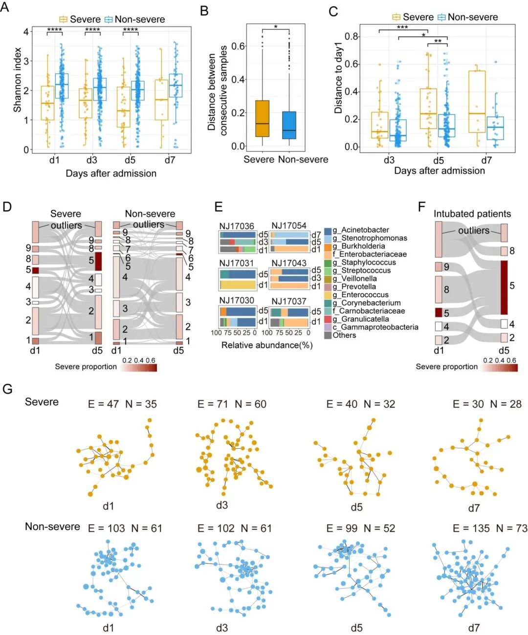 我们研究了非重症和重症病例中痰液微生物组在住院期间变化的差异。结果显示,重症病例痰液微生物组成在连续时间点间变化较大、与初始状态组成差异更大。重症病例中CS转换更频繁,尤其是第1天CS8样本在第5天全部转换为CS5,这种转换可能与侵入性机械通气后的二次感染有关。重症患者痰液中细菌间相互作用网络更为稀疏,且在住院期间有向更稀疏状态发展的趋势,网络中包含更多潜在致病菌,表明其组成相较非重症患者更加紊乱。住院期间,无论重症还是非重症患者的痰液微生物组都未向健康状态转换。