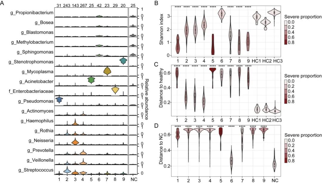 在CAP患者的痰液中,六种常见的呼吸道共生微生物(链球菌、韦荣菌、奈瑟菌、普雷沃氏菌、罗氏菌、嗜血杆菌)丰度最高,占CAP微生物序列总数的51.2%、健康对照微生物序列总数的38.0%,以及阴性对照序列总数的1.4%。CAP患者的痰液微生物组多样性和组成显著不同于HCs,可能的致病菌(如假单胞菌,肠杆菌科,鞘氨醇单胞菌,窄食单胞菌)在CAP样本中显著富集。不同个体间的痰液微生物组表现出显著异质性,聚类分析发现了九个不同的聚类(CSs),其中CS2-4(占CAP患者的71.1% )以多种共生细菌为主,α多样性较高,且与健康对照菌群组成更相似;CS1、CS5和CS7-9则以单一的机会致病菌为主,α多样性较低,且与健康对照差异更大;CS6痰液样本微生物载量相对较低,倾向于出现在特定患者中,与住院后治疗无关。CS2-4患者的重症率为12.9%,与CS6相似,但显著低于CS1、5、7、8、9(36.4%)。