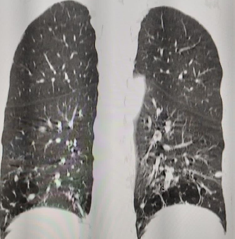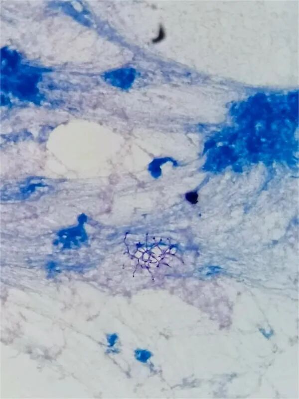 该病例为老年患者,有五年高血压病史,咳嗽咳痰10年史,同时CT示肺气肿,肺大泡,双肺下叶感染。入院前抗感染治疗有所好转,7月17日患者咳嗽咳痰,加重伴有咯血,出现气促症状,临床考虑患者属于免疫功能低下,给予哌拉西林十莫西沙星联合抗感染经验治疗,同时送检痰液行一般细菌培养,检出流感嗜血杆菌。7.22送检肺泡灌洗液,镜下可见革兰阳性,直角分支状,线团样的菌丝体,弱抗酸阳性,培养48小时有表面有皱褶,呈下陷“咬琼脂”菌落生长,质谱仪鉴定为诺卡菌盖尔森基兴诺卡菌。同期肺泡灌洗液外送mNGS:诺卡菌属病原估测浓度>1.0E+6copies/ml。考虑患者免疫功能低下,经微生物室和药学部会诊,改为磺胺类药物口服抗感染,明显好转,于7.28号出院。病人出院后遵医嘱常期口服复方新诺明,十二月底到我院复查CT,CT结果提示肺部感染已完全恢复,病人情况良好。