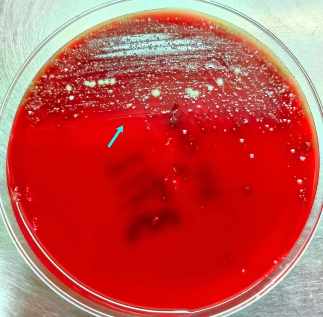 涂片革兰染色:镜下可见革兰阳性,直角分支状,线团样的菌丝体(图一)。抗酸染色:弱抗酸阳性(图二)。结核杆菌DNA定量:阴性。肺泡灌洗液细菌培养:培养18-24h,血琼脂平板上可见针尖大小菌落(图三),分纯48小时后逐渐增大,菌落表面有皱褶,呈下陷“咬琼脂”现象(图四),经质谱鉴定为诺卡菌盖尔森基兴诺卡菌。