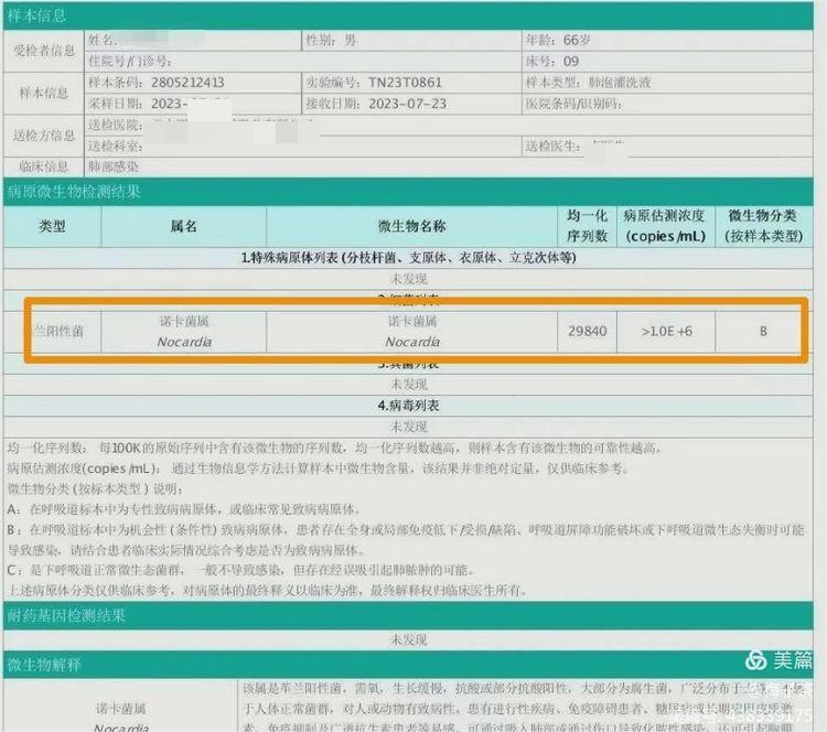 肺泡灌洗液外送mNGS:诺卡菌属病原估测浓度>1.0E+6copies/ml.