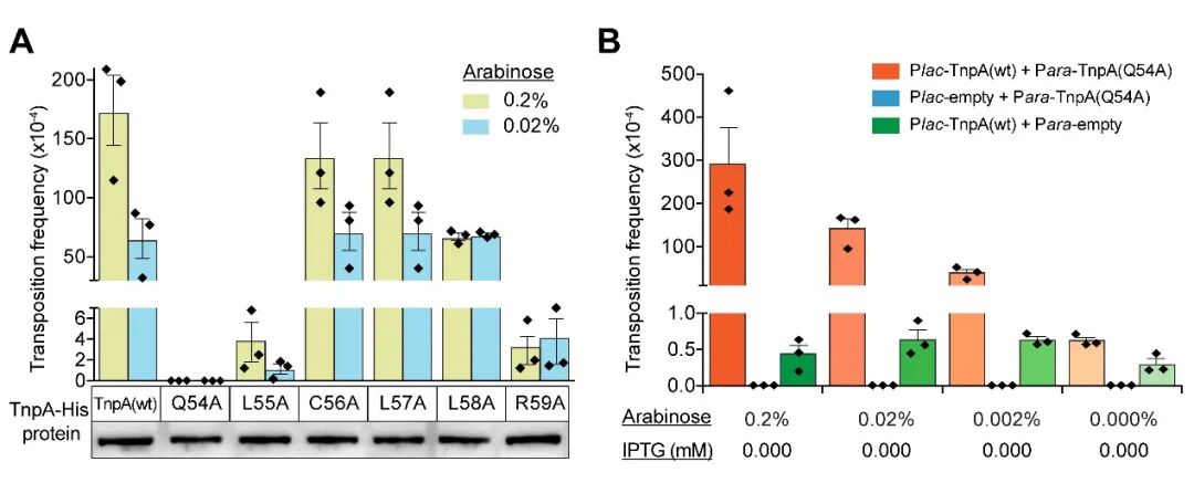 进一步,研究利用定点突变及mating-out转座实验评估QLxxLR结构域在Tn1721转座活动中的作用,发现Q54、L55和R59三个位点对于Tn1721转座活动至关重要。通过TnpA补充表达实验还发现,TnpA二聚体中仅需一个单体即可与DnaN相互作用(图3)。