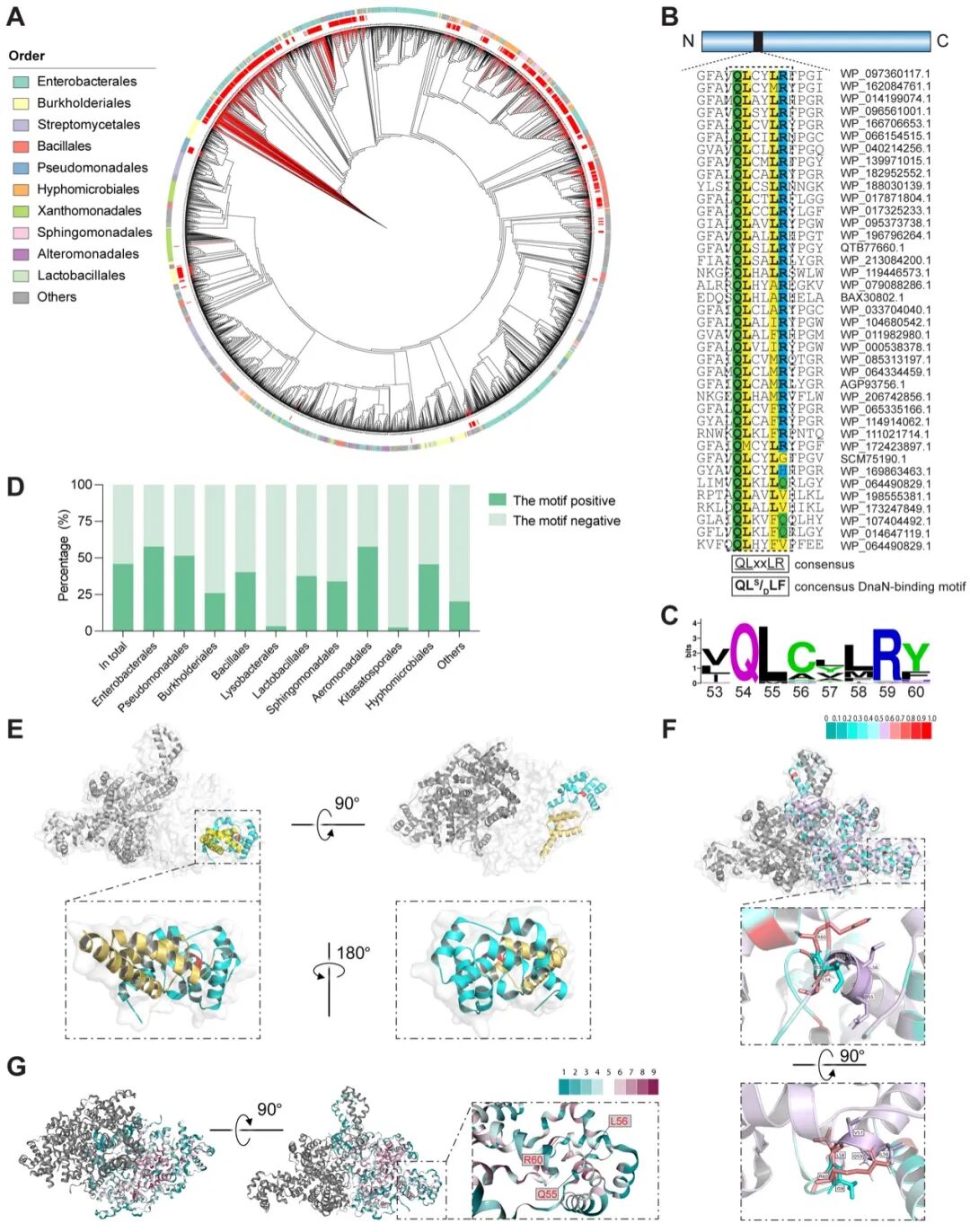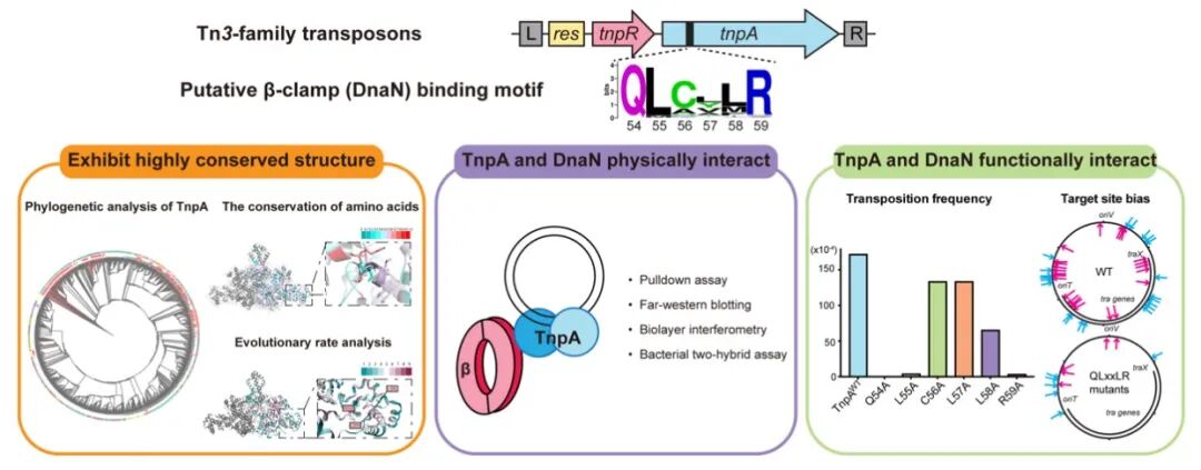该研究通过生物信息学分析发现,46%的Tn3家族转座酶(TnpA)具有保守的QLxxLR结构域,与结合β-sliding clamp(DnaN)的QL(S/D)LF结构域高度相似,提示TnpA可能与DnaN相互作用(图1)。DnaN,即DNA聚合酶的β亚基,是DNA复制过程中重要的活性因子,DNA双链通过在β亚基上快速滑动来完成复制。QLxxLR结构域在肠杆菌目、假单胞菌属和气单胞菌属细菌中的阳性率高达58%,在遗传进化上与特定的分支呈现明显关联,提示QLxxLR结构域是Tn3家族转座子适应进化的结果。研究以Tn3家族成员Tn4430 TnpA蛋白晶体结构为模板,利用AlphaFold2预测了12个代表性Tn3家族TnpA的蛋白结构,综合分析发现QLxxLR结构域及其空间结构临近区域的氨基酸序列均高度保守,且进化速率低,表明这一保守区域不仅具有结构特性,还通过Tn3家族转座子与DnaN相互作用,介导转座子插入正在复制的DNA。