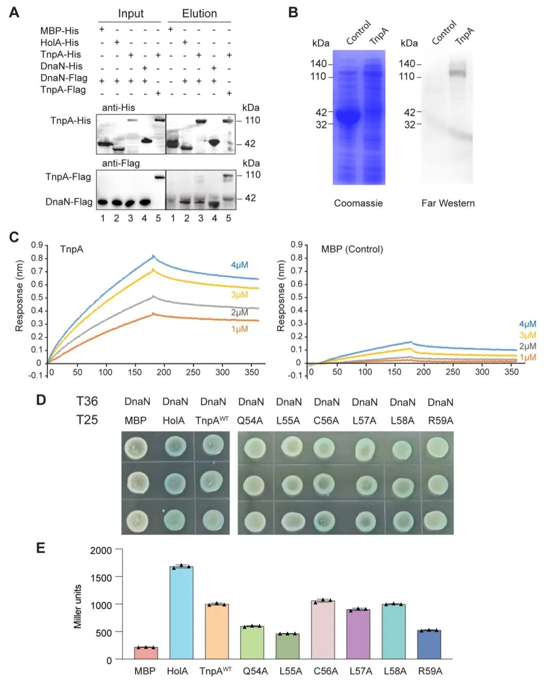为了验证以上推测,作者首先以Tn1721为模型,通过Pulldown、Far-western blot、生物膜干涉实验、酵母双杂交多种实验验证TnpA可与DnaN直接作用,并证实这一相互作用依赖于QLxxLR结构域的氨基酸位点(图2)。