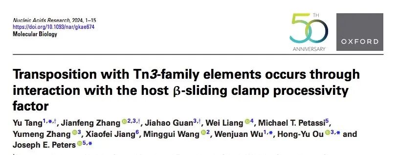 近日,同济大学附属东方医院南院检验科吴文娟团队、上海交通大学生命科学技术学院欧竑宇团队及美国康奈尔大学Joseph E. Peters团队合作研究,在国际高水平期刊《Nucleic Acids Research》(2023年影响因子16.6)在线发表了题为Transposition with Tn3-family elements occurs through interaction with the host β-sliding clamp processivity factor的研究论文,首次揭示了Tn3家族转座子介导基因水平转移,促进耐药基因传播的分子机制,为耐药防控提供了新思路。